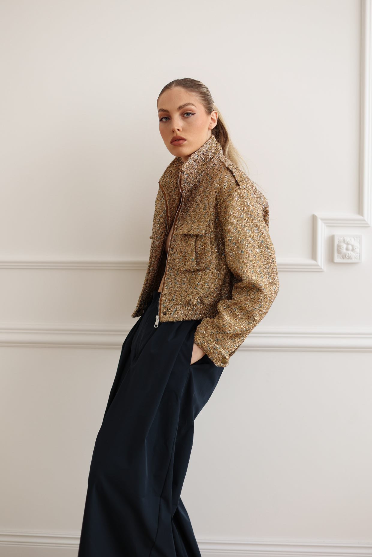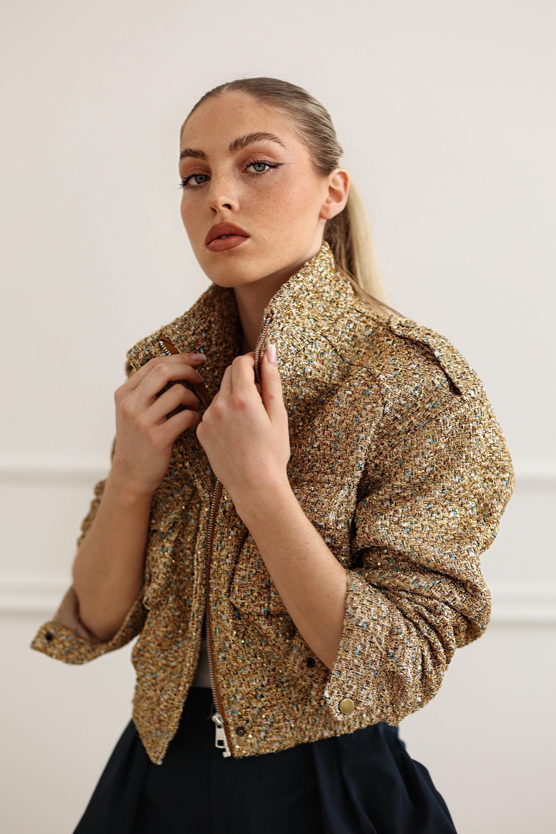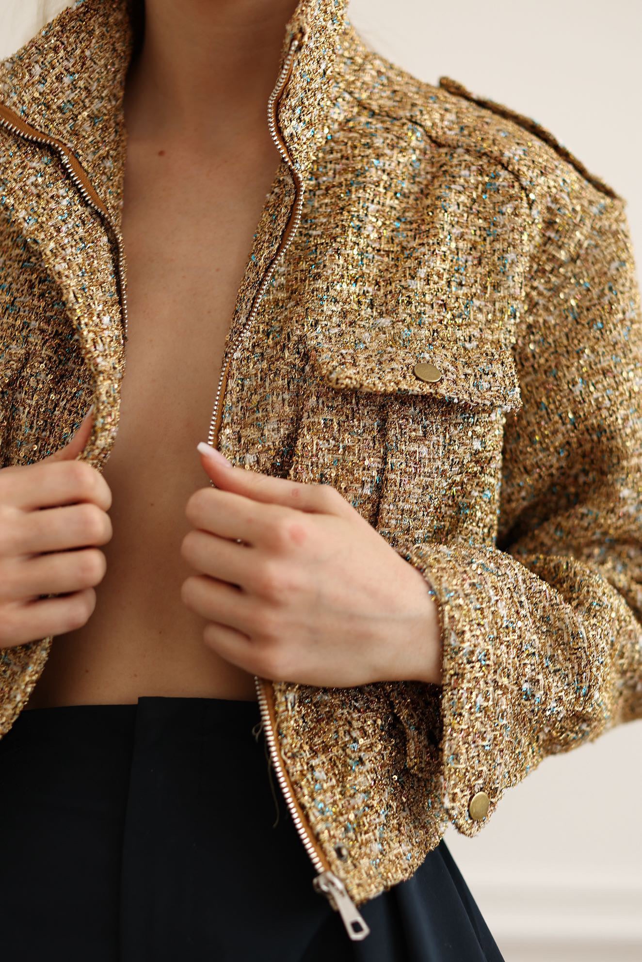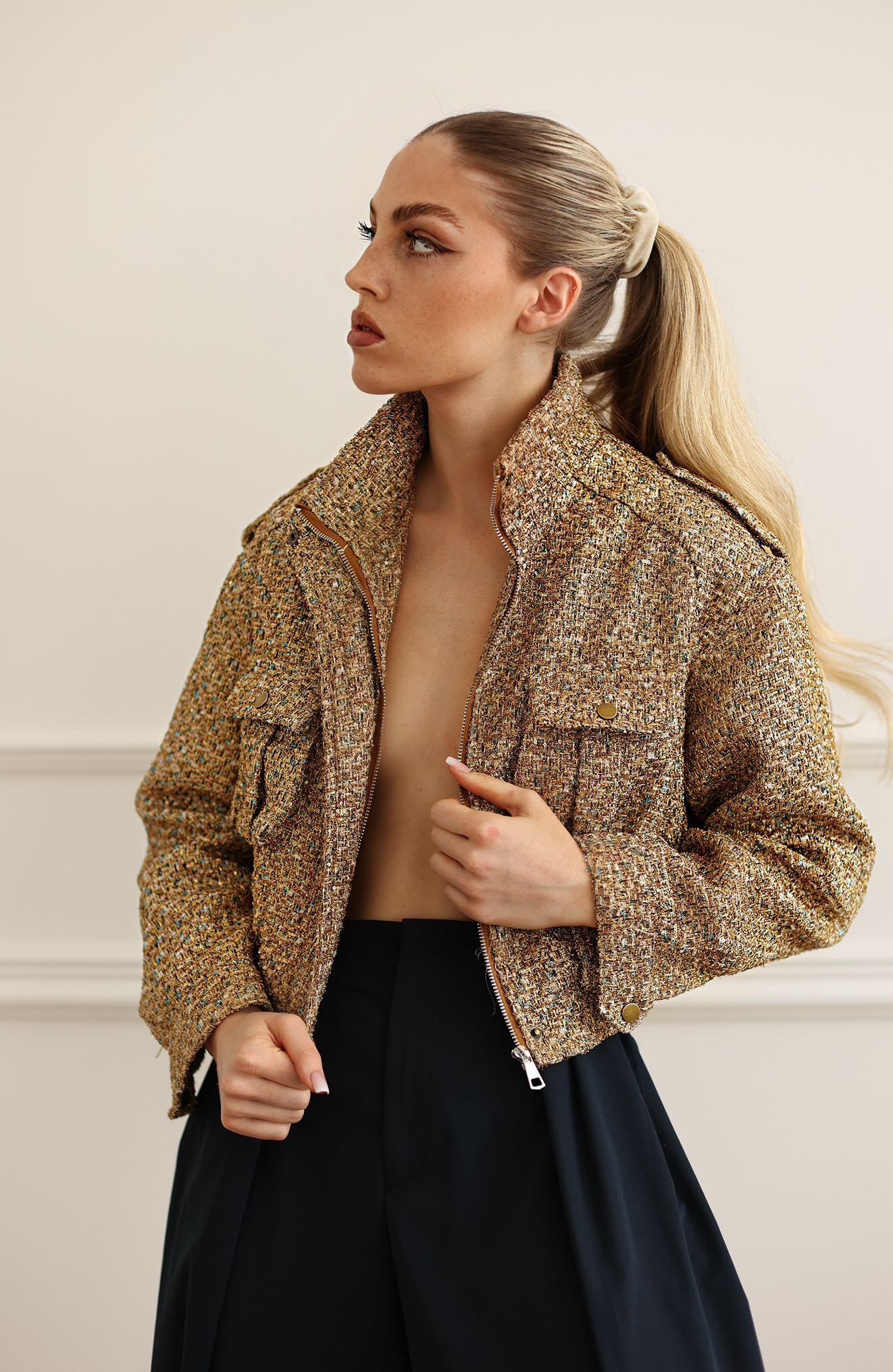 Kurtka o krótkim kroju, wykonana z tkaniny o tweedowej strukturze w odcieniach beżu, brązu, złota oraz srebra z subtelnym połyskiem. W zależności od światła, przybiera unikalnego wyglądu, który zwróci uwagę każdego. Zapinana na zamek oraz zakończona elastycznym ściągaczem, posiada detale, takie jak złote guziki czy pagony na ramionach.