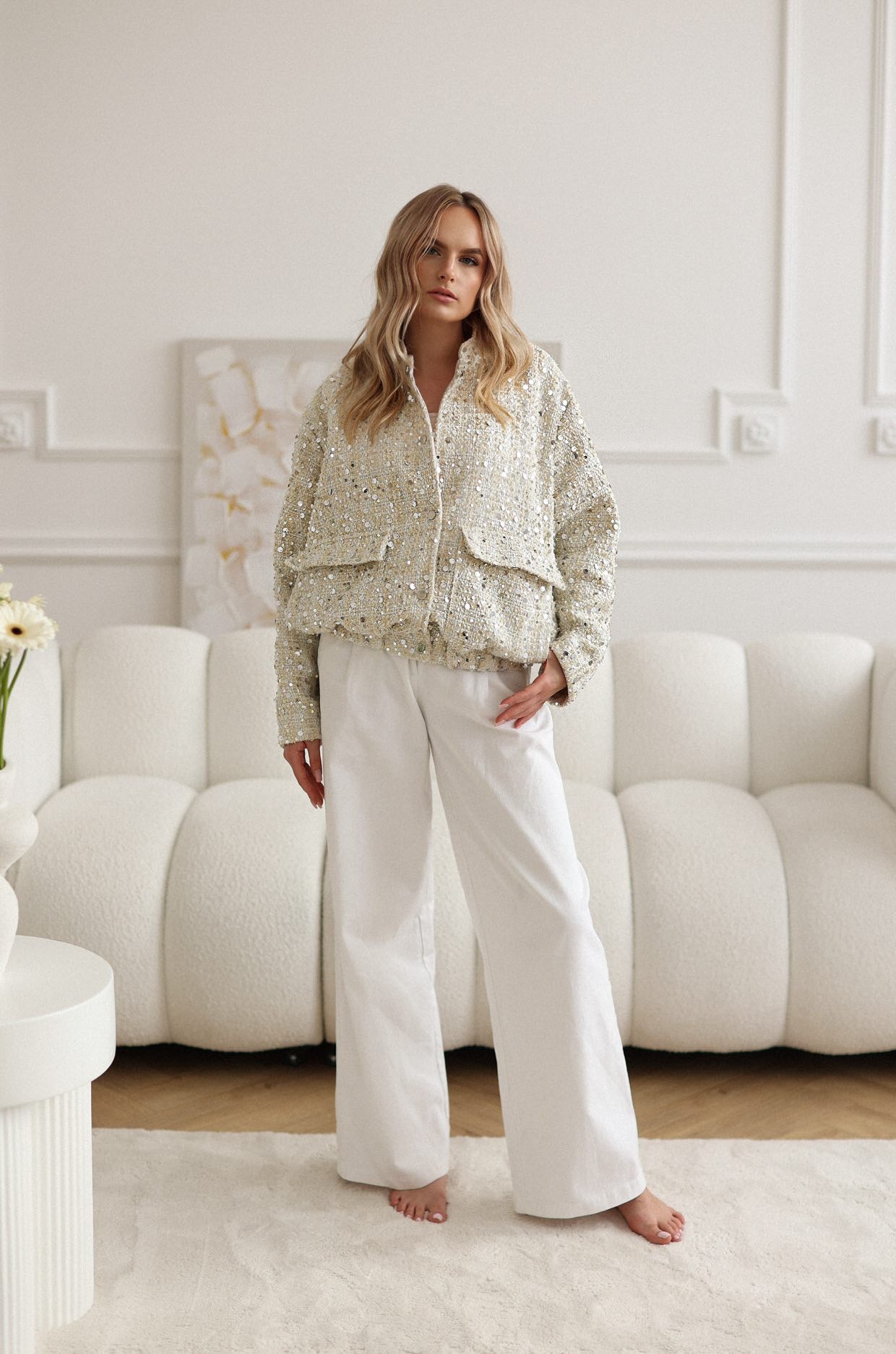 Bomberka TWINKLE to nowa, odświeżona wersja naszego bestselleru. Wykonana z tkaniny o delikatnej fakturze boucle, zachwyca subtelnym połyskiem i bogatym zdobieniem w postaci cekinów. Luźny fason o kroju oversize z obniżoną linią ramion i elastycznym dołem zapewnia wygodę i nowoczesny look. Stójka przy szyi oraz zapięcie na zatrzaski gwarantuje wygodne użytkowanie.