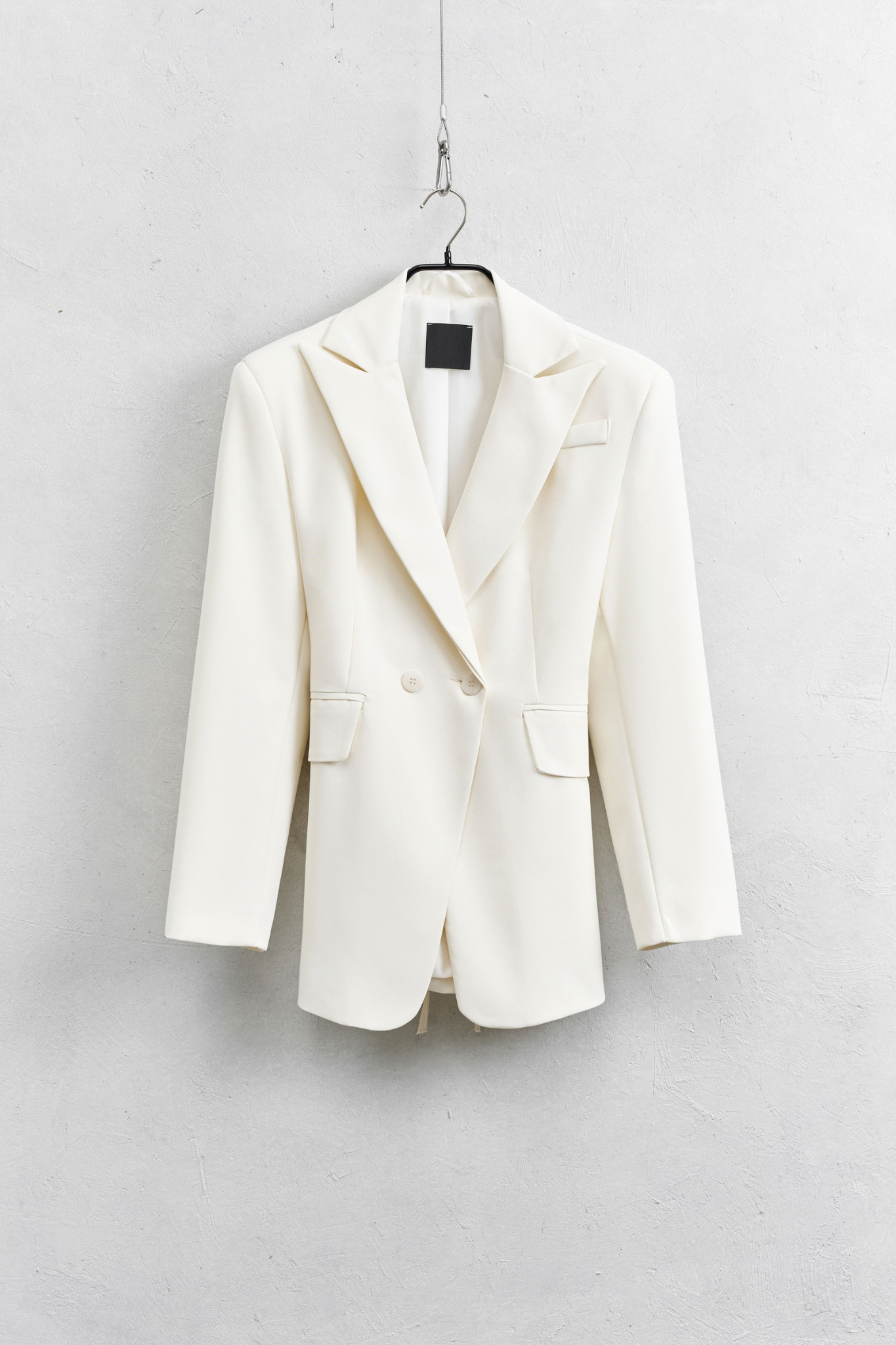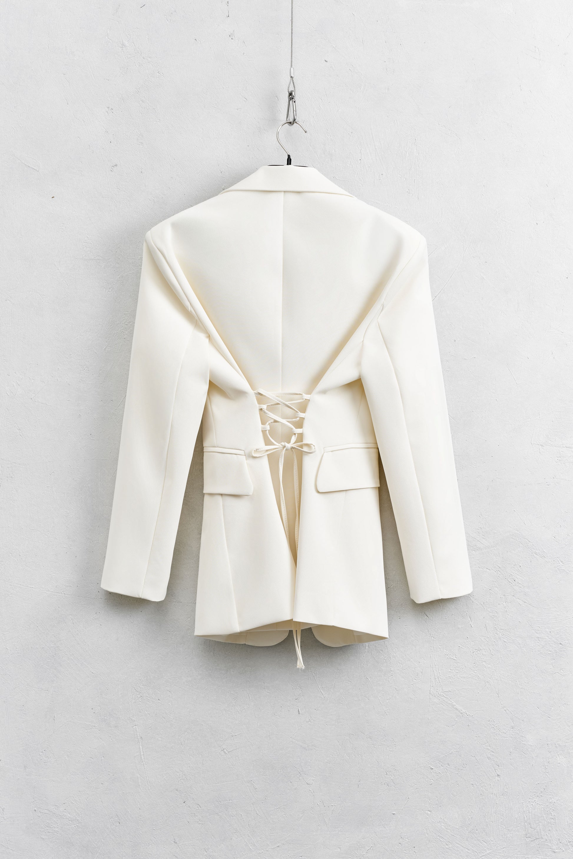 Stylowa marynarka z kołnierzem z klapami i poduszkami na ramionach, które pięknie podkreślają sylwetkę. Dwurzędowe zapięcie na guziki dodaje elegancji, a zakładki i kieszenie z przodu nadają całości klasycznego charakteru. Z tyłu oryginalne wiązanie gorsetowe, które pozwala dopasować marynarkę do figury i wyróżnia ją spośród klasycznych fasonów.