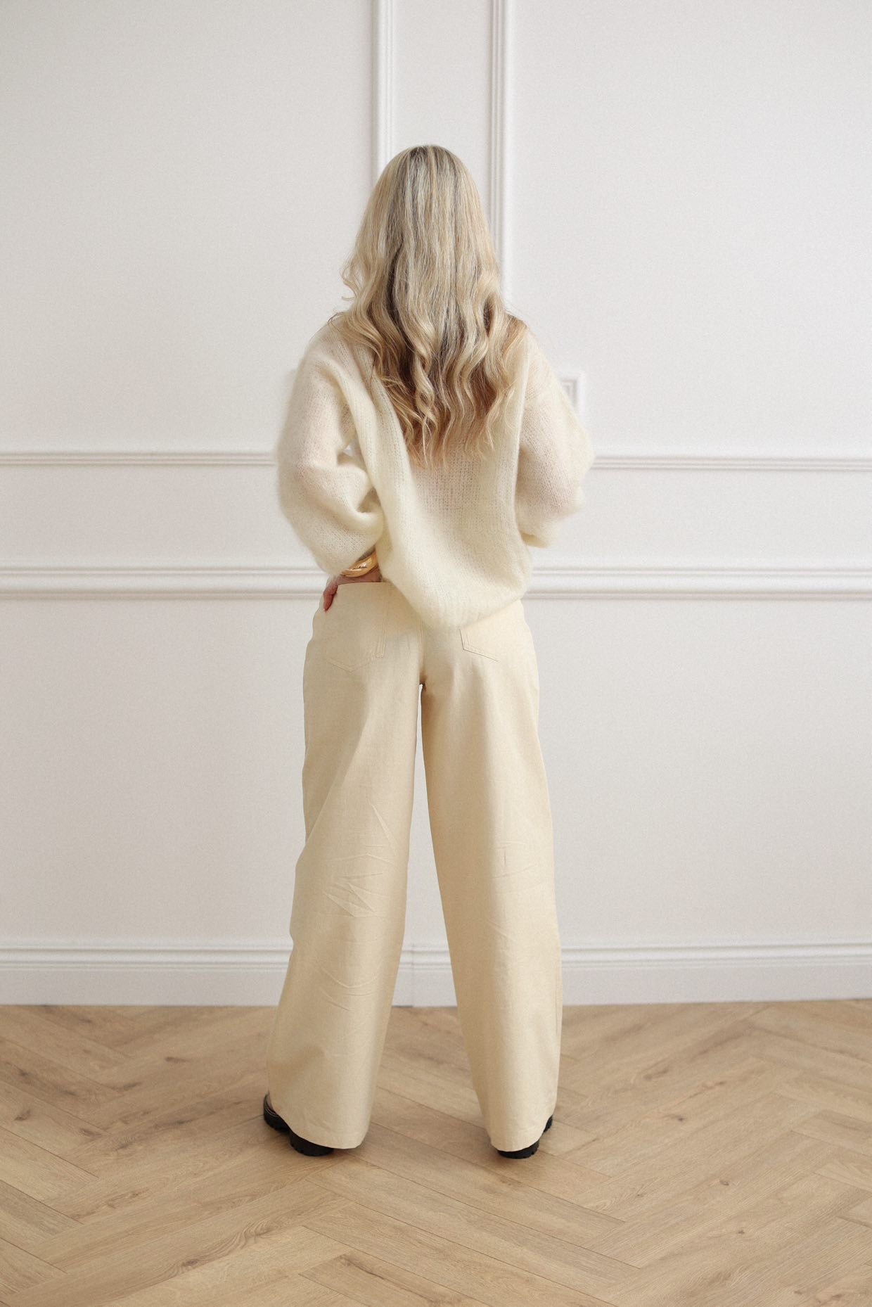 Niezwykle miękki sweter to prawdziwa perełka w każdej garderobie. Wykonany z wysokiej jakości kid moheru, otula delikatnością i lekkością, zapewniając przy tym wyjątkowy komfort. Jego puszysta faktura oraz swobodny, oversizowy krój sprawiają, że prezentuje się elegancko, ale zarazem nowocześnie. Długie, szerokie rękawy nadają mu charakteru, a minimalistyczny design w połączeniu z kremowym odcieniem sprawia, że idealnie komponuje się z jesiennymi stylizacjami.